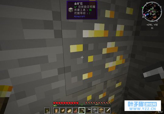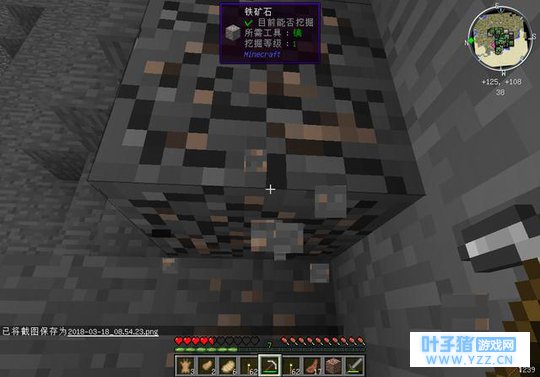 正在挖的方块就是铁矿石了。铁矿石一般成群出现。可以拿石镐及更高级别的镐挖掘。挖掘之后掉落1个铁矿石,需要在熔炉里冶炼后才能获得铁锭。铁锭的用途非常广泛,可以做铁套装,铁套武器,铁轨,矿车,铁块等。另外铁块也可以做信标的底座。