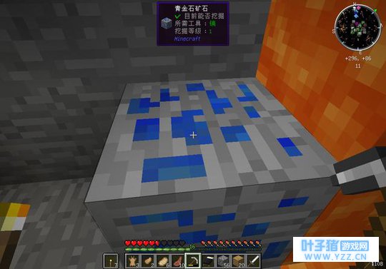 这个方块就是青金石矿石了。青金石矿石可以用石镐及更高级镐挖掘。挖掘后掉落3个以上青金石和小量经验。青金石可以用来当染料、附魔等。
