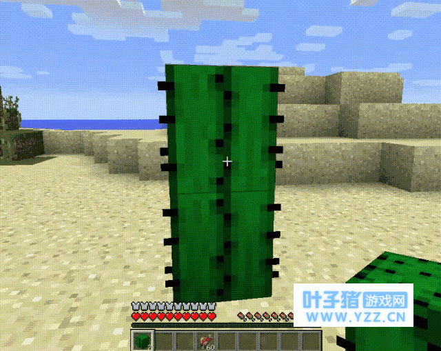 由于仙人掌底部的方块一旦被破坏就会掉落为物品,所以通常情况下你都无法看到它的底部是什么样子的,但是通过切换视角之后手持仙人掌的方法就可以看到了。