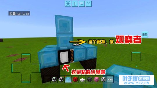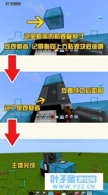 面向上面的粘液方块底部正中心放一个观察者。这个放置起来有一定难度,需要多试几次。 如果放置成功,会听到咔嚓一声,如果不对则没有。 完成后把上面的粘液方块敲掉,在观察者旁边放一个粘液方块。