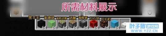 为了能让大家都看的懂,教程有些啰嗦,请各位看官老爷们见谅~ 首先,制作小车我们需要用到的材料如下:羊毛*4个(用来做轮胎,这次用黑色)、粘液块*若干、粘性活塞*1个、活塞*1个、观察者*1个、红石块1个