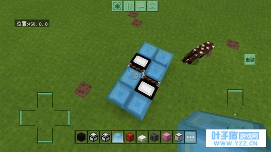 接下来左边粘液方块上放一个粘性活塞,对角上的粘液方块接一个普通活塞。注意,一定要走到两排轮子之间,面对着粘液方块内部放活塞,如果错了最后塞子怼的方向也是错的,车会解体哦。
