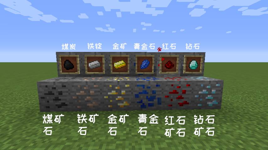 2、矿石:有煤炭、铁矿、金矿、青金石矿、红石矿、钻石矿;需要用不同的镐子来挖
