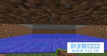 都倒上水之后,我们会发现水流并没有接触到对面的墙壁,还有一格的距离。不过不用担心,这一格是我们故意空出来的,因为水流最远只能流八格远的距离。我们在水流没流到的那一格方块旁边再向下挖一格。