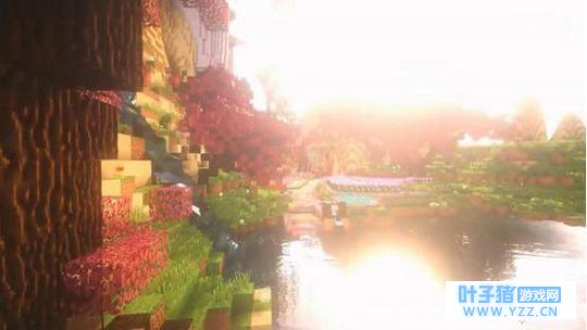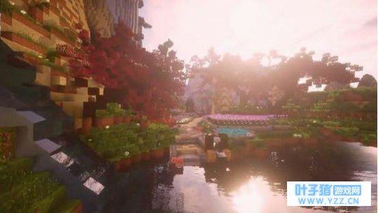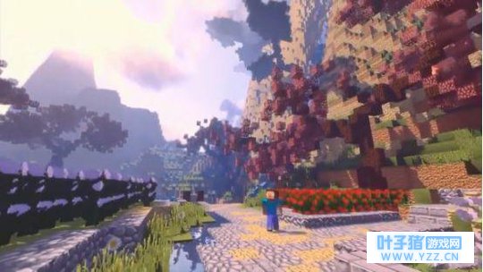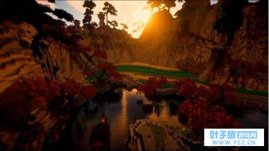 看到山间水边的小路上站着的史蒂夫,就证明了这美丽的仙境其实是《我的世界》里玩家的产物。天边的火烧云和厚重的云层遮盖住了山头,水边的桃花林矗立在岸边,一切都像《桃花源记》里描写的一样美。