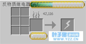 打开转化桌界面,左边的区域用来放入需要让机器学习的物品,然后把原料放进下方火焰的槽位。原料会被转化成EMC值显示在左下角。右边的星阵就会显示当前能够合成的物品。这样就能通过积累获得许多难得的材料啦~ 比如说,花岗岩对应的EMC值是16,而钻石的EMC是8192,这样我们只需要挖8192/16/64=8组花岗岩,就可以换得一颗钻石~ 反物质继电器 现在我们可以收集能量,可以自由转化物品。 但是能量收集器中能量,会被转化成一级又一级的物质保存起来,所以还能有一个强大的储能机器就更好了,反物质继电器就可以解决这个烦恼。