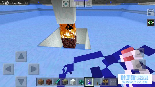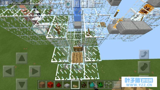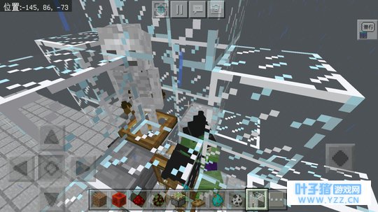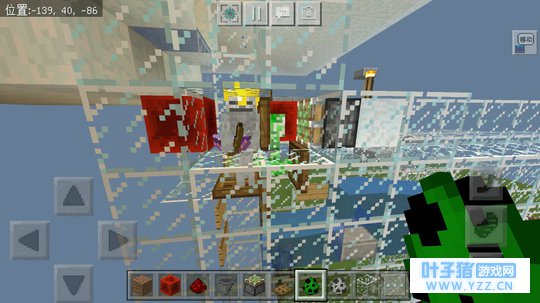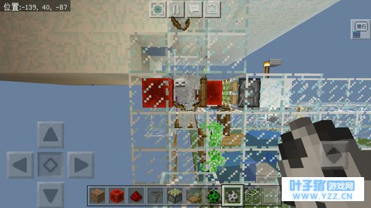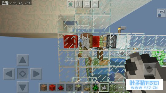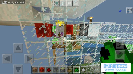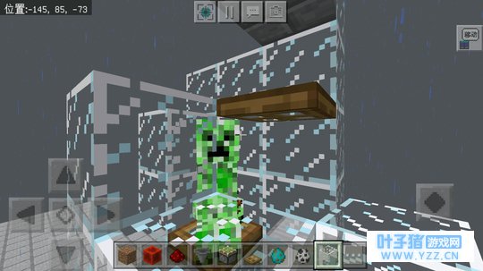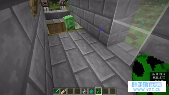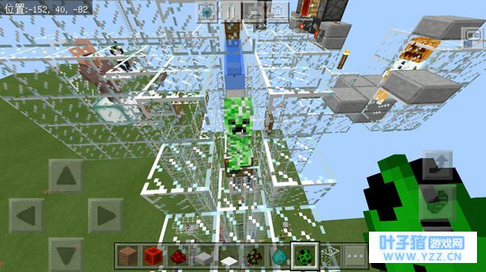 然后苦力怕跳一下就越过活板门上来了,这…… 我们需要在这个玻璃上再放一个方块让它跳不上来