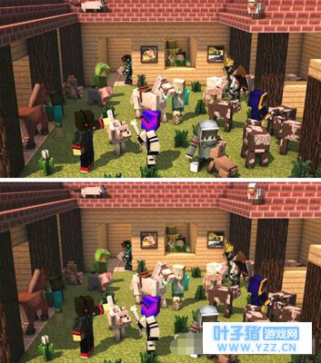 五、《我的世界》Minecraft“找茬”—— 庭院 这张图其实是让小编最为“感动”的一张图。对于《我的世界》大多数玩家来说,MC是一款寂寞的沙盒。我们能圈养Minecraft所有的动物和友好生物,但是却无法聚齐一路走下去的小伙伴。每个人都在庭院中悠闲的享受午后阳光的魅力。所以你能找到图中那唯一的一处不同么?对于材质很敏感的“强迫症”我相信你一定会找到的。