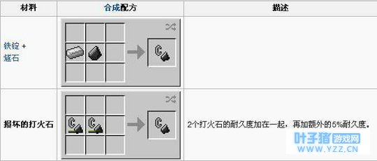 可以铁锭与燧石制作。两个损坏的打火石可以合成一个全新的打火石。