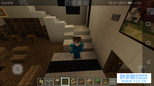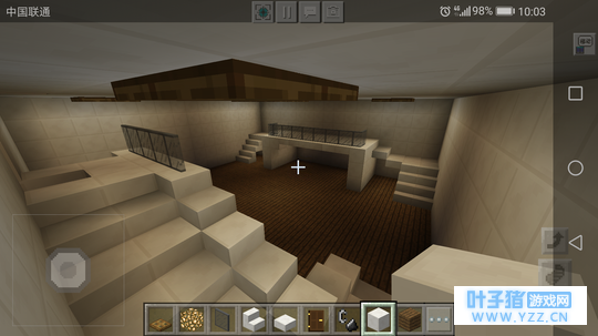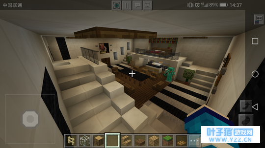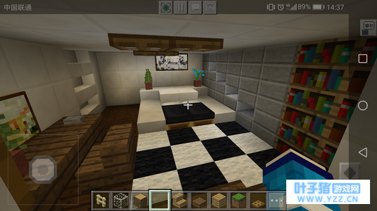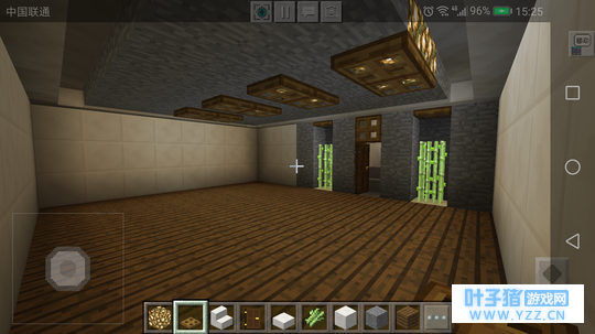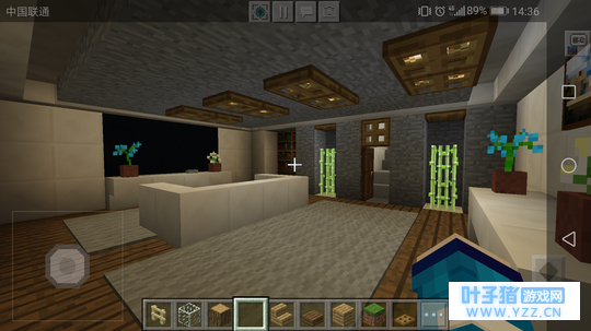 客厅的装饰 其实这之前还有些挖楼梯通往地下的步骤,因为我比较懒,就省略了。嘿嘿嘿~(>_<)四面墙用石英块填充,也就是常说的粉刷墙。门旁边可以用石头填补,中间种点甘蔗给阴暗的客厅带点绿色。我们这次的装修光源来自萤石,应该会有人问为什么不用火把?你想一下,一个现代的装修用火把是不是有点不搭呢?注意萤石下面要用木制陷阱门遮盖。