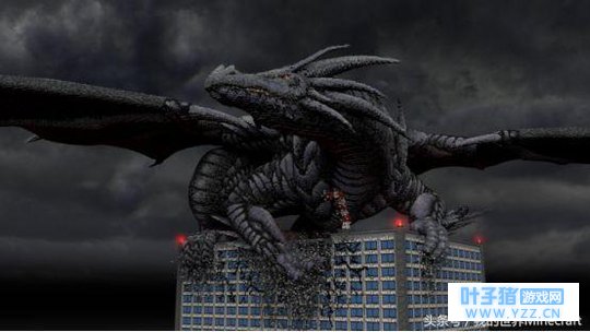 鳞甲清晰的黑龙和现代高耸的大楼形成了对比,充分地显示出这条黑龙巨大的体型。它不知道是因为什么降落在了这幢大楼上。难道是在等着狂殴哥斯拉么?