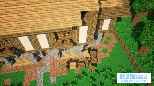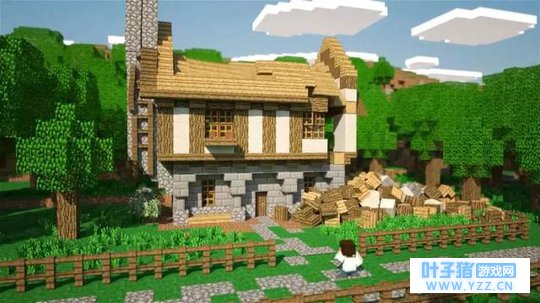 示范例子的是一座古典幽雅的木制住宅。在拥有了真实物理效果的Minecraft里,当下层方块被抽空,上层方块不再悬浮于空中,而是受到重力的影响纷纷掉落下来。