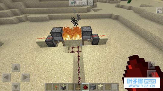 然后我们在红石火把的前一格方式粘性活塞,在活塞的前面放上方块,方块上面放上发射器,两边都是一样,再在发射器中放上打火石,放好之后我们在红石火把的上方,放上方块,再放上红石粉末(活塞上也放红石粉末),这个时候我们拉动拉杆就会发现燃起了熊熊烈火,再拉动拉杆火就会灭…