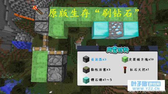 活塞、粘液块实际上是Minecraft最为神奇的方块,是他们改变了Minecraft的方块。各类自动门,自动电梯全都有他们的身影。而图片中的装置,也是“刷钻石”方块最简便的方法,这是没开作弊的原版生存。此方法已在最新版的1.13中测试,可以说是《我的世界》全版本通吃的“刷钻石”方法了。
