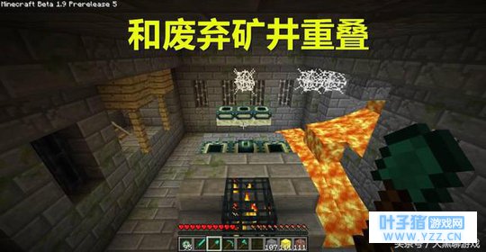 要说要塞中最重要最核心的房间,那一定是它-传送门房!在系统生成要塞时,若是没有生成末地传送门房那么整个要塞将会重置重新生成,从这就足以看出这个房间的重要性。 传送门房的作用不用多讲了吧,这里就提两个有意思的地方,第一传送门房和要塞入口的距离至少会隔5个房间,第二末地传送门有万亿分之一概率直接开启!下图又是一个比较特殊的情况,一座废弃矿井穿过一个末地传送门,而在要塞中发生这种和其他地牢等遗迹重叠的现象还不少。