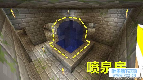 相对来说喷泉房遇到的概率就要稍小一点,但它也种较常见的房间。它由石砖砌成水池,中间有类似的水柱结构喷出水流,其实老玩家都知道这些都是装饰而已,真实情况只是在石柱顶上浇了一桶水,然后就形成了这种“喷泉”效果,如果有兴趣,你也可以给自己家里造几个。