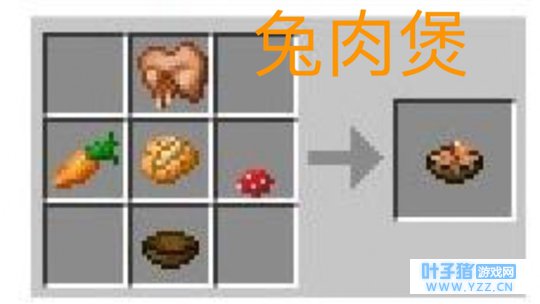 第二,兔肉煲。这是一种看起来很高大上的食物,制作起来却不简单,它需要马铃薯、胡萝卜、兔肉、蘑菇等等才能合成,当然效果也是可以的,它能给玩家恢复10点饥饿值和12点饱和度。但是如果把这些制作食材分开来食用的话,效果却远远不止这样,可以恢复更多饥饿值。所以兔肉煲就相当于是一顿大餐,好吃却不一定能吃饱。