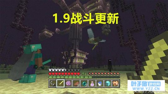 Minecraft发布的1.9版本也被称为“战斗更新”,它发布于2016年2月29日,该版本极大幅度的改变了战斗系统!玩家在该版本中实现了双持,手持盾牌,以及飞翔(鞘翅)!剑的格挡被移除,以及骷髅的AI增强也是在这个版本实现的。