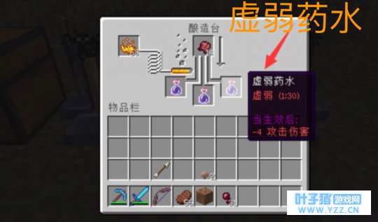 第三种,虚弱药水。这是一种很重要的药水,和力量药水简直就是绝配,它还是pvp和打怪必备的药水,而且非常适用于防守型的玩家,当然不是给自己喝的,要加入火药扔到敌方身上。虚弱药水能延缓怪物的进攻能力,降低它们对自己的伤害,可能比穿个盔甲都好用。而且还能用虚弱药水和附魔金苹果拯救僵尸村民。制作虚弱药水需要发酵的蜘蛛眼和粗制药水,同样加入红石可以延长药水时间。
