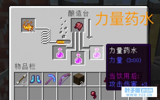 第二种,力量药水。这是一种持续性的打怪必备药水,喝了之后秒变大力士,增加三点近战攻击伤害,也就是一颗半心,再配一把附魔钻石剑,杀怪效率大大提高。喝一口力量药水,妈妈再也不用担心我打不过怪物了。而制作力量药水则需要粗制药水和烈焰粉,一般是三分钟的效果时间,加入红石粉可以延长药水效果时间到八分钟,如果加入萤石粉,伤害翻倍,但是时间会减半。