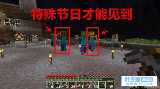 在一个特殊的节日中,一种隐藏极深的怪物你可能就能发现,那就是戴着南瓜的僵尸!而这个特殊节日就是万圣节!这个特性早在1.4.2时就被加入到了游戏,并且在2013-2015年的三年间,每个万圣节都会出现这种戴南瓜的怪物!而且除了僵尸,骷髅、僵尸猪人、爬行者和凋灵骷髅等等都可能会带上南瓜,甚至是发光的南瓜灯,很是稀罕!