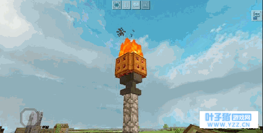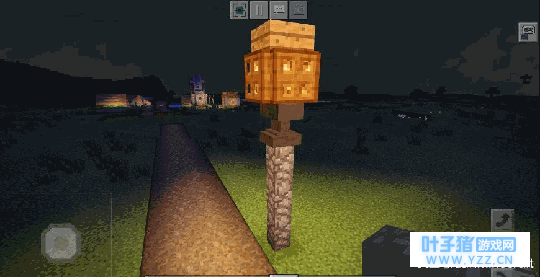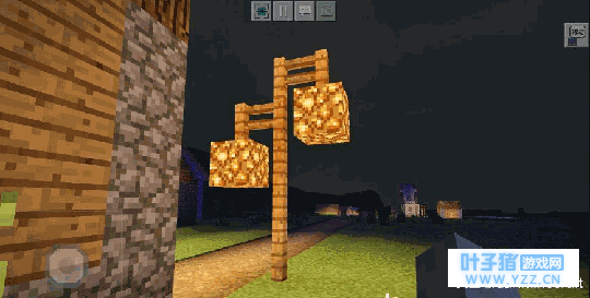 这是在《我的世界》大型村庄常见的一种灯。材料是“木栅栏+黑色羊毛+4个火把”。这种灯简单而且实用,如果你选择村庄作为基地的话,做几个这样的路灯放在路口,是非常不错的选择。 顺便说一个PC版独有的特性。在PC版的Minecraft,如果你看到一个村庄有这种灯,却没有火把,基本上可以断定这是“僵尸村庄”。手机版僵尸村庄最显著的特性就是村庄内有苔石建筑。 2、火焰地灯