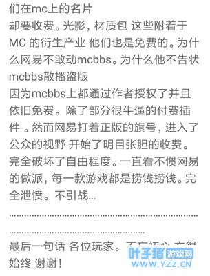 以上转载taptap我的世界国区正版评论 从以上的评论可以看出。网易我的世界官方打着正版的旗号开始公开的对各种皮肤地图mod进行收费,而游戏中许多的bug也没有修复。外挂更是无法无天官方也没有即及时的处理,玩家素质也是十分的差,更有玩家在评论中说道我的世界中国区只不过是MOJANG想到中国圈一波钱。 最后希望网易能够改变自己管理我的世界的方式使这个世界更美好!欢迎大家在评论区留言.关注.点赞.收藏.分享.谢谢! 本文来源:bilibili,作者:骗钱兽的游戏,转载请注明来源。 |