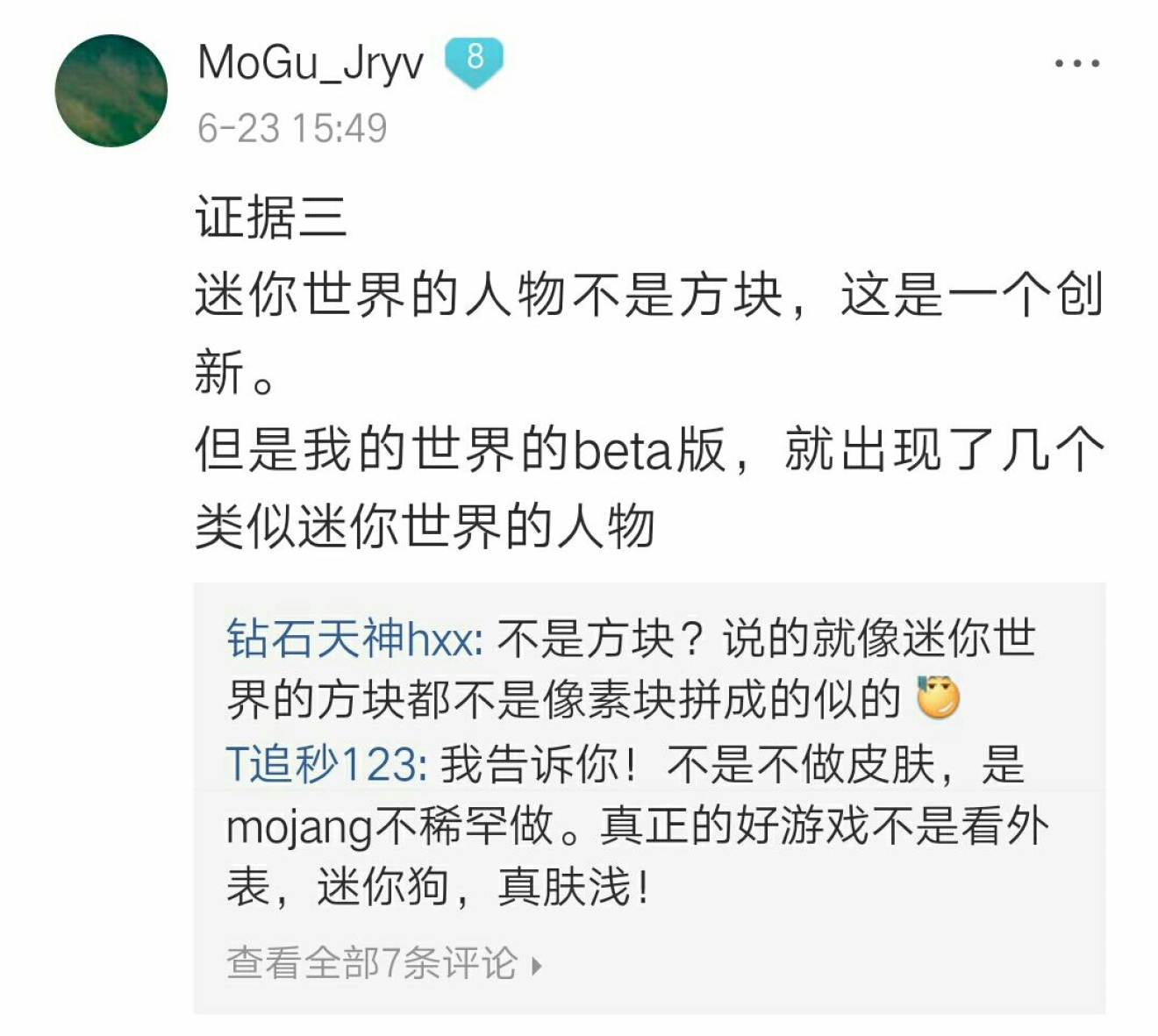 迷你玩家谣言 迷你世界抄袭是不争的事实,但是迷你世界官方始终咬牙不承认,其玩家亦是为其辩白。 有投机者在游戏出处与时间上做文章,说迷你世界是一位老人开发的,不幸老人去世,后mc抄袭迷你世界并且发售,老人儿子便立刻发布了这款游戏…… 显然传言是假的,为了利用不知真相的低龄玩家与mc玩家嘴炮。假如迷你玩家的“战将”们自知理亏还会与我的世界玩家们刚吗?双方阵营互骂为“狗”还有一些非常不雅的词语不再一一列举 最可气的是下面这位