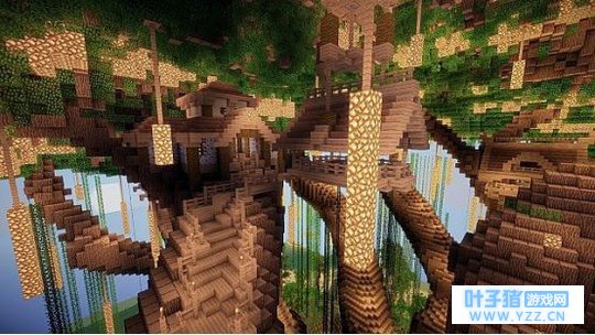 树屋的设计十分精巧,基本上参考了树干枝杈的走向,由于枝叶密集,还专门准备了萤石来照亮周围的环境。 托瑞亚精灵树作者:Lucky_Light