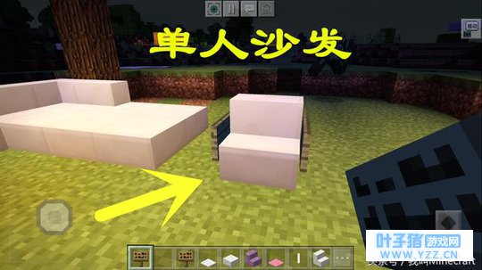 这是《我的世界》最简单的一个“单人沙发”,单人沙发是用“石英阶梯”和“告示牌”制作。实际上如果你的房子主体材料是木头的话,这里用木制阶梯会跟告示牌更加的搭配。只可惜现在的告示牌还不能染色,在原版Minecraft中,在一间小木屋里放置这样一个简单的“单人沙发”看起来还是相当舒适的! 四、“极简风”——大型沙发
