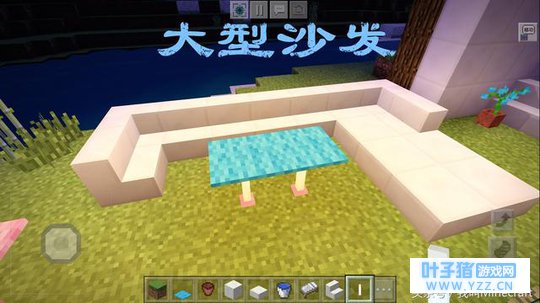 很多玩家都喜欢“现代极简风”的建筑,实际上我们根本无需附加太多的材质和光影。原版的《我的世界》一样可以打造出极具现代风的建筑。所以白色也就成了主色调,因此“石英方块”是你必须要大量获取的方块。 这里的大型沙发主体材料便是“石英阶梯”和“石英半砖”,因为光源的原因,中间的“茶几”依然选用末地烛。实际上MC的沙发是可以实现“坐”的功能,这就需要用到矿车等材料。但我们今天的主题是“极简、简易”,所以过于复杂的家具今天暂不介绍。 五、“极简风”——洗手池?