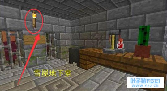 火把之三:雪屋的地下室 雪屋里面的火把是有两种的,一种是红石火把,是在雪屋当中床的周围,另一种才是我们今天说的火把,它是在地下室里面,两个牢门的当中。不知道这么阴森的地方,谁在这里点燃了一个火把呢?仔细想想有木有觉得后背冒凉气呢?