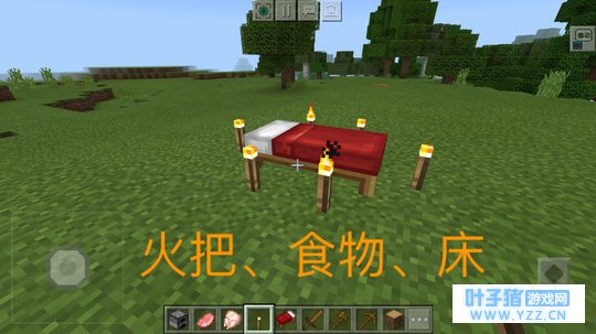 第三套,床、火把、食物。这就是保你安全度夜的最好装备,首先是一个床,需要在白天找到羊,用羊毛和木板合成,如果实在没撸到羊毛。那么火把和食物就是你必须要准备的,想一想在困难模式的夜晚,没有火把该有多么痛苦,就是把自己埋到地下,也需要火把,否则光听着怪物的恐怖叫声就吓得够呛了,如果没找到煤炭,可以用熔炉烧成木炭。而且在困难模式下,玩家的饥饿值会下降得很快,所以要准备好足够的食物,记得把生肉放熔炉烤熟再吃。