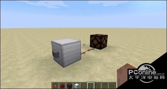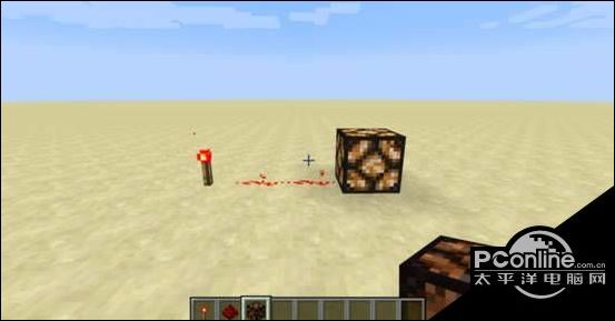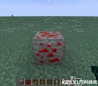 红石矿石在第16层以下非常常见,在14层以下,大约1.025%的石层会生成红石矿石,故每个区块平均有25个红石矿石。——来自中文MinecraftWiki 红石矿石被挖掘后会掉落若干个红石,也可放进熔炉烧出一个红石 红石可以被摆放在地上,多个红石放在一起可以相连。 大家暂且可以把红石电路当做现实中的电路,但之后就会发现它们的不同之处。 在这里我用Minecraft1.7.2来作例子。 第二课:你的第一个电路 好,现在开始制作你的第一个电路吧! 首先,像这样做一个红石火把: 然后,像这样做一个红石灯: 然后,这样摆: