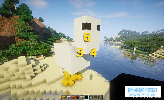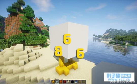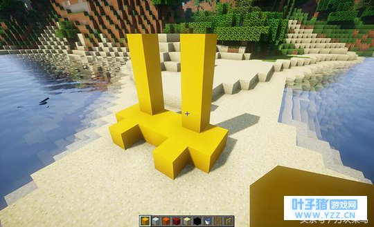 菜鸟君喜欢将游泳池建在高处,想来想去觉得将游泳池建在小鸡的身上是个不错的选择,这样可以一边泡澡一边俯瞰远处的风景,想想都惬意,那么让我们开始建造吧。 首先建造小鸡的脚,腿部建造4格高,材料用的是黄色混凝土。