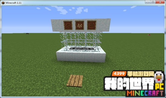 5.然后将投掷器围起来,做成一个机器的样子。中间的玻璃最好用玻璃板,这样我们踩在方块上就可以拿到里面的爆米花。最上面再放个牌子,贴上种子,这样一个爆米花机就算彻底完工啦!
