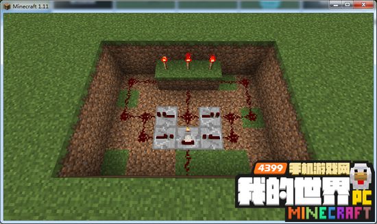 2.三个红石火把上放向上的投掷器(发射器也行),比较器输入端的红石粉上放一个方块,然后放上压力板,再为投掷器里装上爆米花,爆米花可以用各种种子来代替,这样爆米花机主体就做好啦。