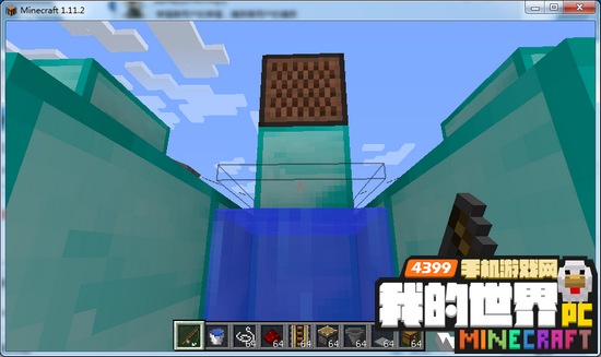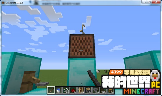 6.当鱼钩甩出以后,我们就会被活塞顶起来,画面正中间就会是音乐盒,而对着音乐盒按右键不会收回鱼竿,只有钓到鱼的时候才会收回!音乐盒可以用按钮,告示牌,展示框,木质栅栏门来代替,不过音乐盒效果最佳!