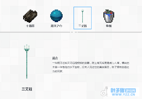 游戏玩法也发生了变化,最直观的便是方块种类的增多(干海带快、蓝冰、珊瑚块等),它们都能作为材料使用。另外,道具也变得更加丰富,海洋之心、三叉戟、鱼桶都能为海洋探索带来便利。你还能为三叉戟施加全新附魔(穿刺、引雷、激流等),有效提升探索效率。总的来说,海洋更新中的内容相当丰富,需要耗费一定的时间进行研究。