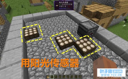 阳光传感器同样能开门,而且用它还制作成夜晚关门,白天开门的自动化装置,又简单又实用。而且除了开关门,阳光传感器还能做夜晚自动照明等等装置,非常给力。 方法8.用红石块