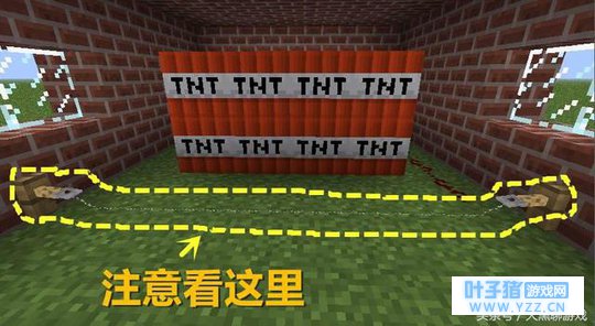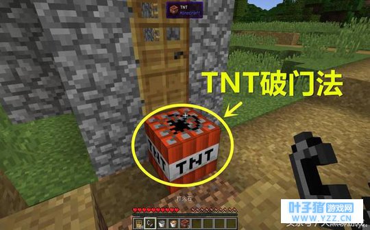 用活塞也能开门,而且它的开门方式非常暴力,直接就把门给推掉!活塞在收到信号后就会推开前方的东西,一些方块活塞会将它们推开,而一些物品,当被活塞推动时会直接给推掉,掉落成可拾取的物品形态!没玩过的玩家去试试看吧。 方法12.用TNT炸掉