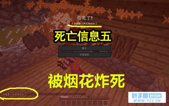 这个死亡提示也不多见。当玩家在岩浆块中死亡时,就有可能会出现“因XX步入危险之地”的死亡提示。当然这个XX可以是因为逃离僵尸猪人,也可以是在逃离另一个玩家时。注意这个岩浆块是下界的“岩浆块”,另外除了这个死亡提示,另外两个也有可能出现“发现地板是一层熔岩”或者“发现地面是岩浆”。 死亡信息五.随着一声巨响消失了