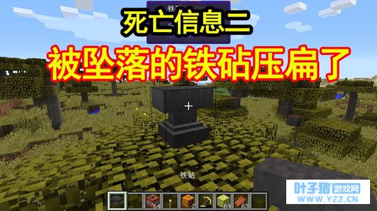 铁砧是受重力影响的,所以被放置成实体状态的铁砧一旦掉落,轻则压坏花花草草,重则砸死苦力怕,压死斯蒂夫。而是史蒂夫被压死后就能看到一个死亡提示“被坠落的铁砧压扁了”,很形象也很贴切。这个死亡提示难遇到是因为需要自己作死或被别人做的铁砧陷阱害死,不知道你有没有经历过呢? 死亡信息三.在试图伤害时被杀
