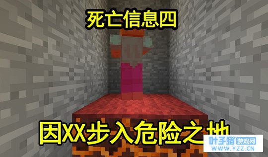 这个死亡提示就更难见到了。当玩家和身穿“荆棘附魔”的玩家战斗并死亡时,就有可能会出现这个提示。当然除了玩家外和穿着装备的生物,乃至和守卫者战斗而死时,都有概率出现“在试图伤害XX时被杀”的死亡提示,你有没有遇到过呢? 死亡信息四.因XX步入危险之地