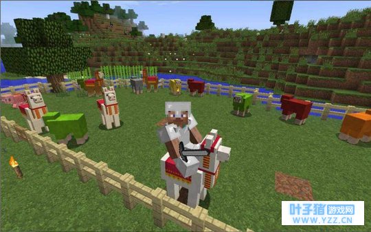 2. 羊驼 羊驼生成在峭壁和热带草原处,它是中立型生物,玩家若是激怒它,它会朝着玩家啐唾沫。驯化它的办法是对着它一直点右键直到点出心形,驯化之后玩家可以骑在它身上,但是不能移动,我们可以用栓绳牵引它,这样它周围的所有羊驼都会排着队跟随,是一种非常有趣的生物。