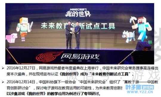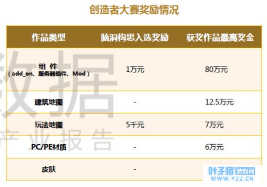 2、开发环境:国内开发环境良好,目前仍处于探索阶段。 在国内《我的世界》被正式代理较晚,功能性开发正处于探索阶段。但从发展环境来看,《我的世界》具备一定优越性。一方面,《我的世界》曾获得过中国未来研究会的认可,为其功能性在国内教育方向的展开打下了基础。另一方面,《我的世界》代理方网易公司在运营稳定后,通过“创造者大赛”来吸引开发者,意图营造生态系统。其中奖金设定上,网易游戏更加注重组件方面,组件的开发人才也将是拓展功能性应用的核心力量。