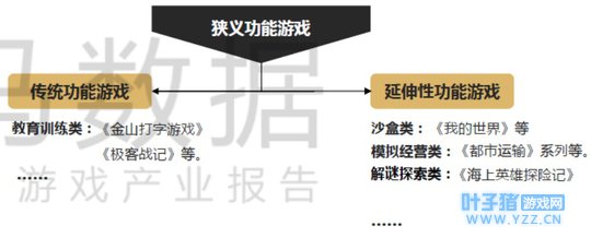 广义的功能游戏一般是指一切具备娱乐性功能以外功能性的游戏。而狭义的功能游戏则是指企业研发初衷或者在运营过程中,有意愿将游戏与功能相结合,使用户在使用中达到学习教育、技能训练、康复治疗等娱乐以外的目的,虽然目的相似,但从出发方向来划分可以分为两类。 第一类为传统功能游戏,强调功能的游戏化,即研发初衷就是为了解决社会与行业问题,将游戏的元素、设计、技术和构架创新应用于其他领域,主要包括教育类游戏、训练类游戏等,典型代表如《金山打字游戏》《极客战记》等。 第二类为延伸性功能游戏,强调游戏的功能化,即游戏研发初衷并不以解决社会或行业问题为唯一目的,在实际过程中进行跨界应用,并取得一定成果的游戏。主要包括沙盒类、模拟经营类等,代表产品有《我的世界》《都市运输》系列等。本报告将主要针对狭义的功能游戏展开。