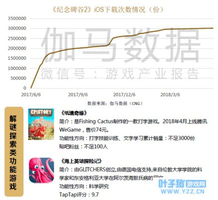 三、解谜探索类游戏:总体市场表现欠佳,商业化空间较为有限。 解谜探索类游戏属于冒险游戏的分支,是一类通过对游戏中出现的信息或情节进行分析和处理,发掘线索解决各种谜题的游戏。其覆盖功能性也较广,包括学习教育、知识普及、技能训练、科学研究等。 游戏性方面,知识普及与技能训练等功能性元素更易于融入,体现在游戏性质上,解谜探索类游戏主要玩法是通过对游戏中出现的信息或情节进行分析和处理,发掘线索解决各种谜题的游戏,具有较强的未知性与逻辑性。 市场表现方面,解谜探索类头部产品表现欠佳,除《纪念碑谷2》外收入鲜有过亿级产品游戏,同时《纪念碑谷2》也出现了这一类型后续销量乏力的特征。 目标受众规模方面,从解谜探索类游戏整体来看具备一定人气。在TapTap上相关品类关注量较高,代表产品《纪念碑谷2》的关注量更是超过100万,上线一年的时间全球总设备安装量超过了3000万份。 发展空间方面,解谜探索类游戏卖点更多体现在功能性主题上,整个市场尚未打开,再加上游戏类型本身限制,与商业化程度有限的独立游戏有较高重合,此类游戏在商业化层面将面临较多困难。但是这类游戏创意性强,进入门槛与成本低,在提升品牌方面有较高价值。