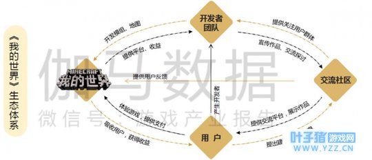 4、成熟的生态体系 国际上《我的世界》成熟的生态体系成为功能性应用发展的良好土壤。一款游戏的生态体系是指以一款游戏为核心形成一种互利互惠共同发展、较为完善的产业结构。以功能性为例,在《我的世界》生态体系下,只要运营官方设置功能性应用方向的组件开发奖励,开发者就会自发创作投稿,同时通过《我的世界》官方平台和交流社区推广到用户,用户意见也会不断地反馈给开发者与《我的世界》官方得以改进,形成一种良性的循环,这为《我的世界》功能性的开发提供了良好的发展土壤。