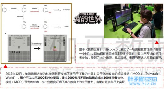 三、《我的世界》功能性开发方向及案例 根据调查发现,目前《我的世界》功能性主要开发方向为学习教育、知识普及、艺术创作、工程应用、康复治疗等。相对于国外,国内代理《我的世界》较晚,对其功能性的开发还比较有限,主要体现在工程建筑与知识普及方面。目前《我的世界》在国外功能性开发的案例已有很多,这也为国内《我的世界》功能性的发展确定了探索的方向,随着相关机构与开发者的探索,未来有望在国内得到更多应用。 学习教育:目前已经有所成就,突出于编程、化学等方向,生动地将学习内容展现给学生。 知识普及:类似于教育方面,将平淡的内容生动化,更容易为用户所接受,利用用户覆盖优势,更大程度实现其知识普及的功能性。 艺术创作:利用游戏中各种物体以像素块的形式搭建创作或还原景物是最早为用户所发现的功能性之一,目前仅国内较有名气的作品便已超过百份。 工程应用:在工程应用方面的功能性体现在设计与规划上。政府可以低成本将城市规划设计方面利用《我的世界》众包出去,获取创意与居民意见。 康复治疗:康复治疗也是《我的世界》功能开发的重要方向,主要体现在心理治疗上,例如针对自闭症儿童的康复治疗等。 1、学习教育 《我的世界》在教育方面的功能性体现出较大优势。主要是相比传统的书本课程,通过《我的世界》来进行授课可以更加生动表现课程内容,增加学习的趣味性。目前,《我的世界》在教育方面代表性的领域有编程、化学等,在更多学科和教学内容方面仍在继续探索中。